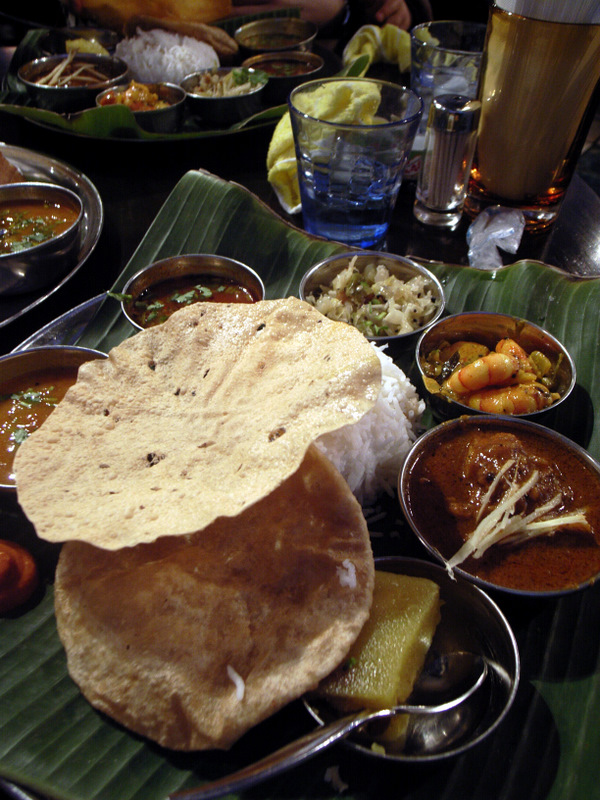 次いで出てきたダバミールズには、(隠れて見えないが)インドのバスマティ米と、プーリ、パパド、カレーは、チキン、魚、海老、サンバル、ラッサムスープと野菜のスパイス炒めがついてくる。