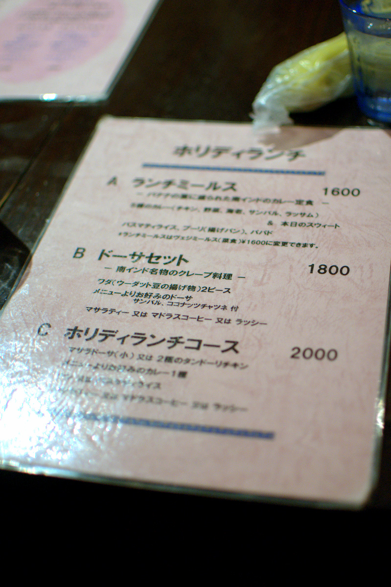週末のランチメニュー。ミールスを頼んで、グループで行く場合は、その他の単品でドーサを頼むことが多い。