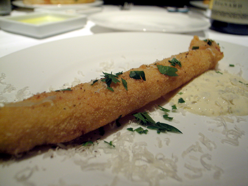 ホワイトアスパラのセモリナフリット。セモリナを使うことで周りがカリッカリッ。アスパラの食感とジューシーさとの対比が美味しい。家でもできないだろうか・・・。