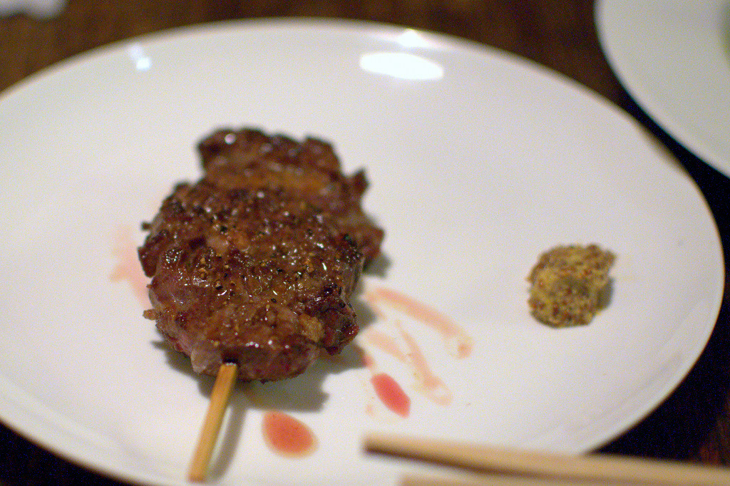 カリッとした歯ざわりで始まり、サクッと中に歯が通り、溢れる肉汁と塩が旨さを紡いで口に広がって終わる。旨い!ハラミが大嫌いな人と4人で来れば1人であと3本食べれるのに、と思わざるをえない。