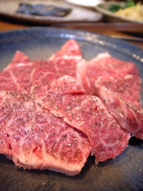 塩上カルビ(1,450円)。見た目に違わぬ美味しさ。山葵醤油で食べるのだけど、脂の強い美味しいカルビには山葵醤油がベスト。これを食べると、ああ焼肉のタレってのは余り美味しくない肉を食べるための工夫なのだ、と思える。山葵を追加してより後味さっぱりに食べるのが好み。山葵のために胡椒は振ってない。