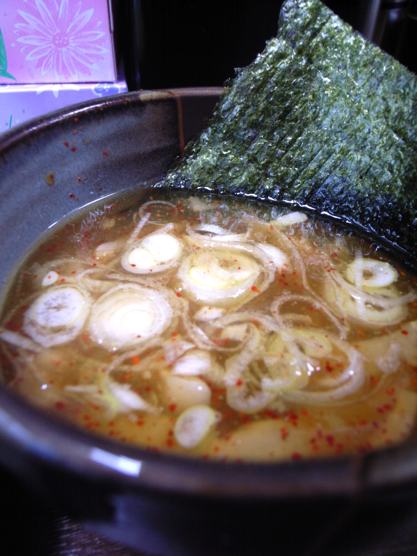 スープは甘みと酸味と旨みのバランスがよい魚介系ととんこつ系のブレンドだろうか?。唐辛子の辛味が結構利いている。辛味を頼んだら結構辛そう。テーブルには玉ねぎのみじん切りと魚粉が自由に入れられるようになっている。辛さを除いては、味の傾向も、具も、自由なトッピングもつけ麺やすべえに似ている。好みのタイプ。2つのお店に何か関係があるかもしれない。