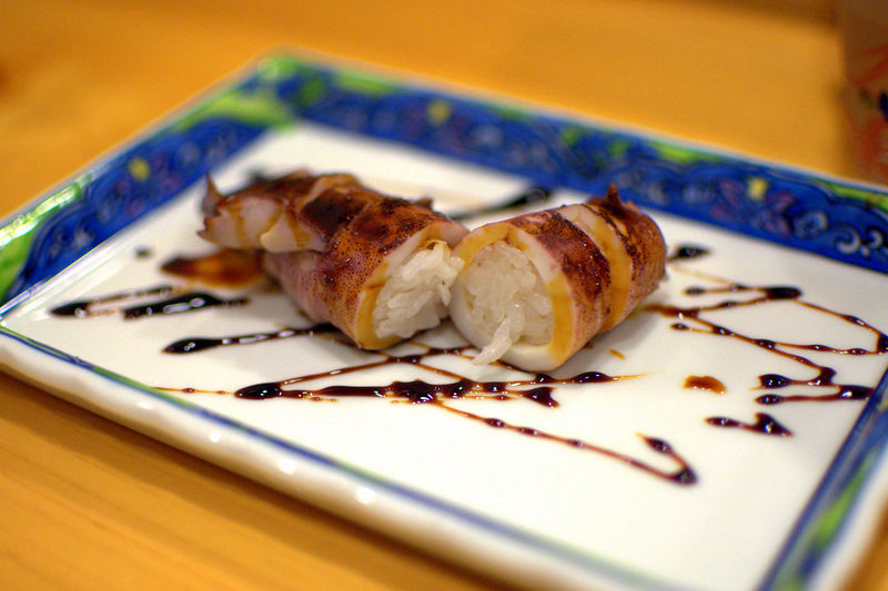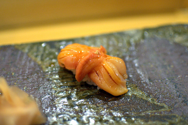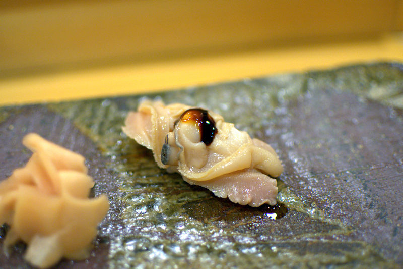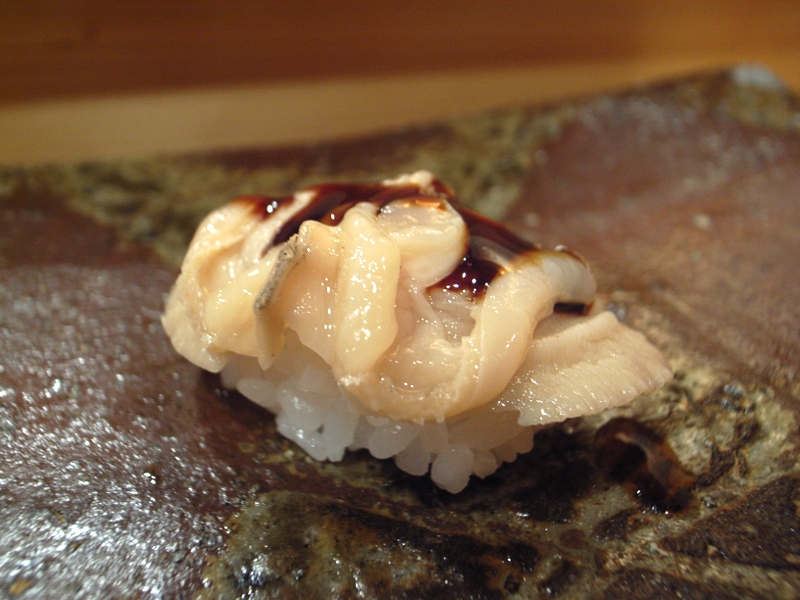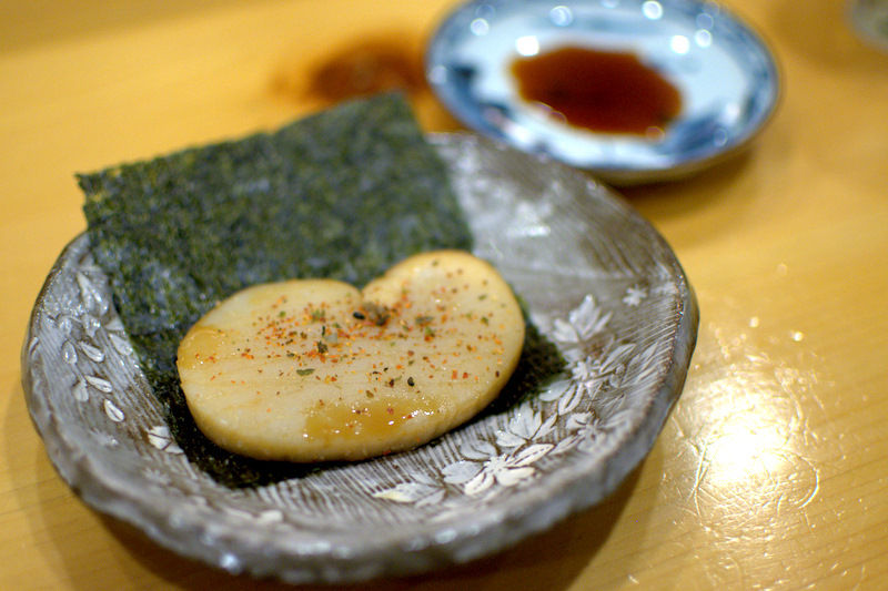 平貝の磯辺焼き。平貝のしっかりした歯ごたえと七味をやや効かせたピリ辛い味。これはかなり好みだ。ワインバーのタワシタでは雲丹や梅肉をあわせたり、ウメットでも帆立で同じようなものを提供されていたかも。