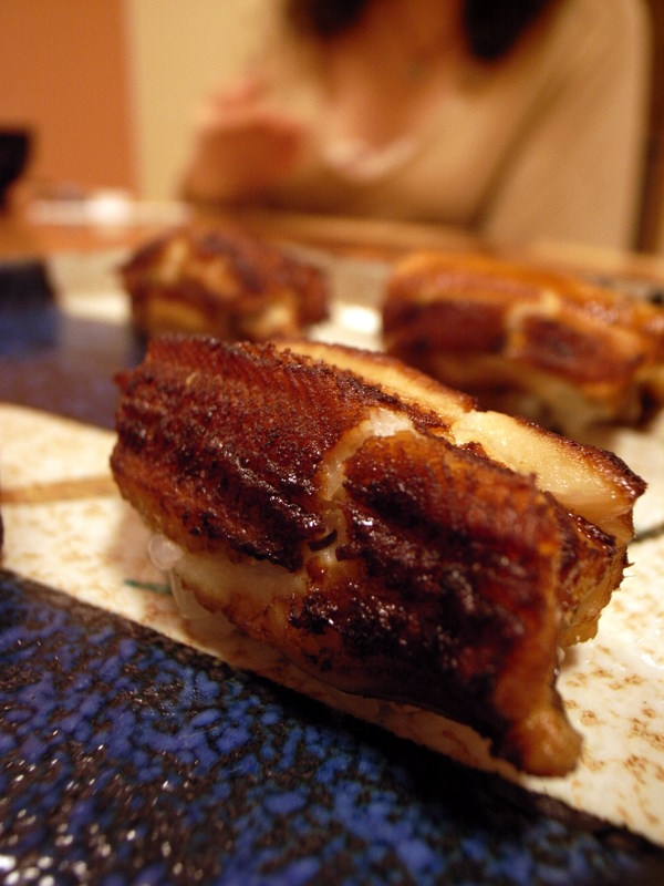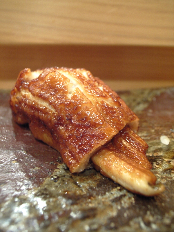 ダブルの穴子。2重に重ねられた穴子は、表面が香ばしく、身はふっくら。シャリとの量のバランスもバッチリ。そして何より絶妙な温かさで供される、抜群の美味しさ。