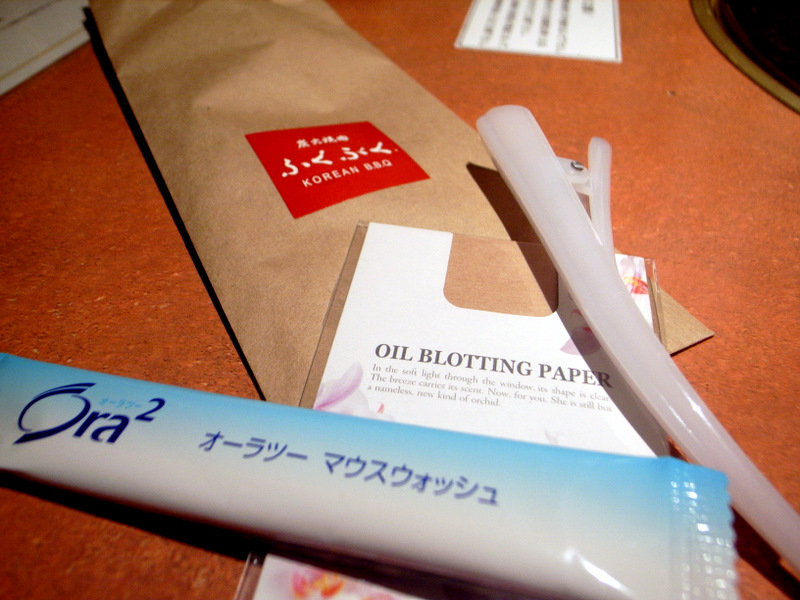 最初に女性に配られるセット。脂取り紙や髪留めまで、気遣いが細やか。