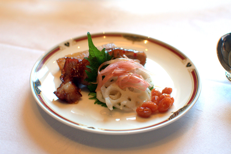 前菜の盛り合わせ。蓮根や豆が入って精進風。