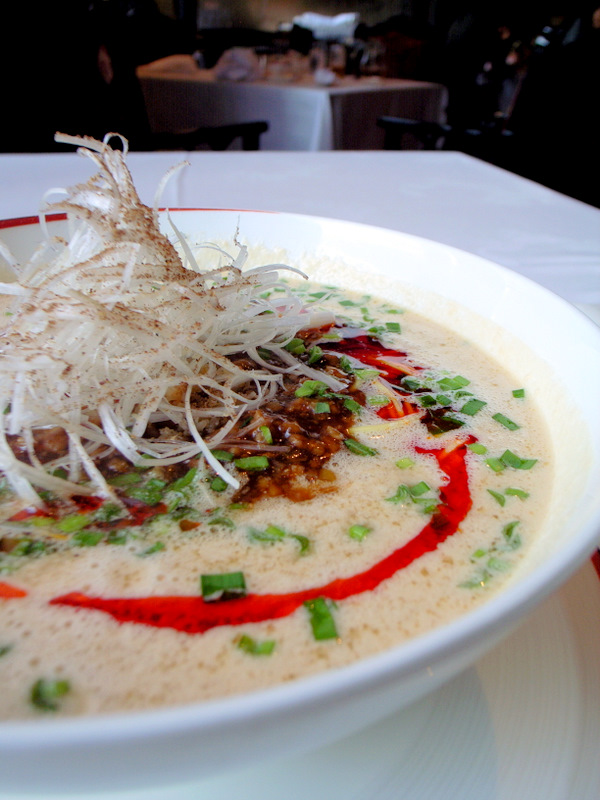 出てきた瞬間に「ココナッツミルク!」と思ってしまうほどの、白い担々麺(1,680円)。見た目のインパクトからすると、個性的な味を想像するのだが、、胡麻のコク、甘い肉味噌、じんわりとした辛さ、全体のバランスがいい味わいで、完成度の高いもの。