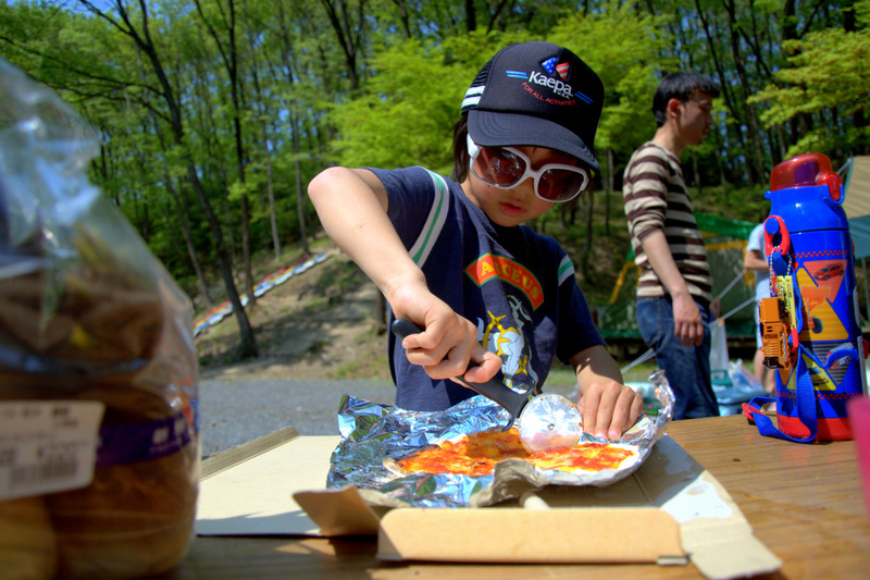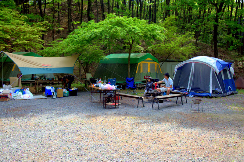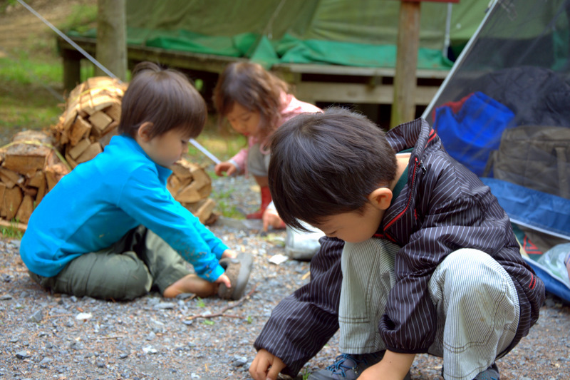 キャンプ場は、ボーイスカウトの集団以外はGWにも関わらず空いている穴場で、常設テント付近のドーンとスペースを陣取って、ちょっとした村を構える。