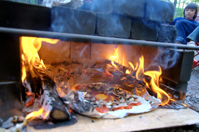 1号が逝ってしまった後は、2号を。レンガを組んで、網を敷き、その上に更にレンガで蓋をする。完全な密封はできないけど、まあ即席にしては立派なピザ窯の完成。