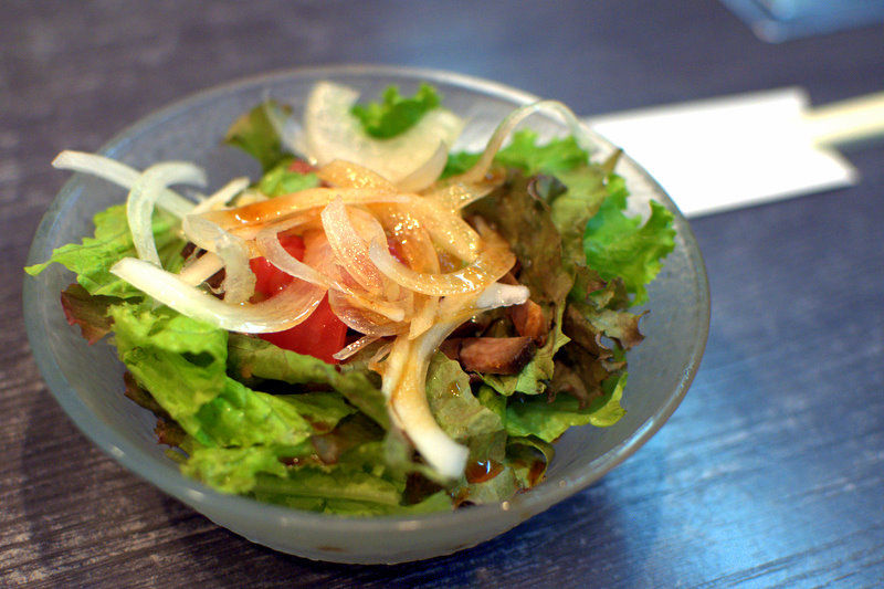お通しに、サラダとキャベツが出てくる。サラダは肉入り。
