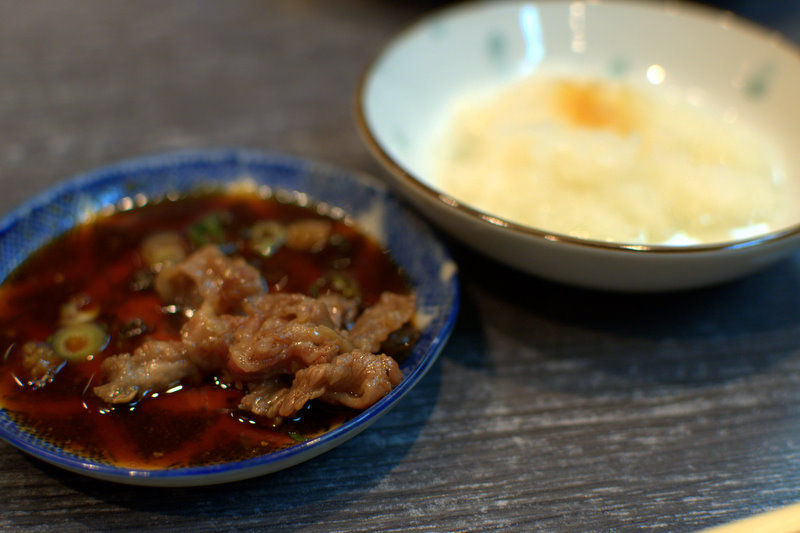 上ロース塩(ポン酢、2,500円)は、辛めのポン酢タレにつけて食べる。