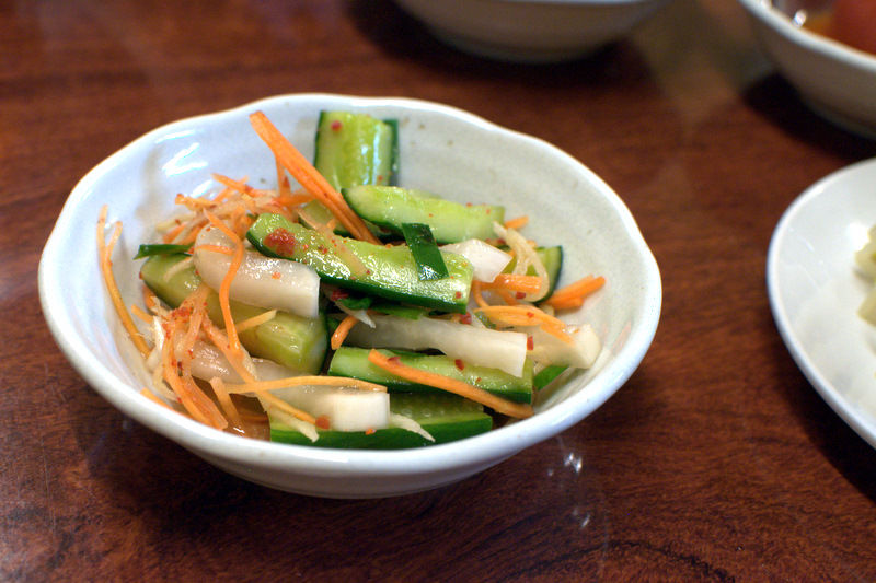 キムチ3種盛り(900円)。3種別々に出てくるひとつは、オイキムチ。