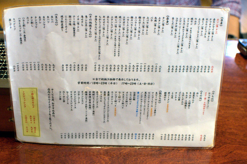 京都肉旅行より。煙がモクモク、カウンターと座敷、リーズナブルなホルモン中心のラインナップという、京都ホルモン焼きの聖地「アジェ」。匂いがついてもいい服装で店内で席に着く。メニューを見ると、戸惑うぐらいに細かくびっしりと並んだ、そしてどんなものかがわからない名前の肉達がずらりと並んでいる。その中から外せないメニューとして、名物のほそ塩、赤せん、天肉、極上ハラミ、などをセレクト。こちらはタレも独特で、牛出汁のうまみにお酢の酸味を強く利かせた、冷麺スープのようなあっさりつけダレで、脂の強いホルモンによく合う。