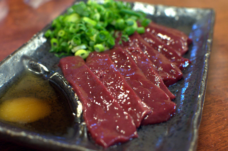 生レバ(900円)。レバ刺しの美味しさは、その店のホルモンの美味しさを図るひとつの基準になるが、こちらも例外なく美味しい。