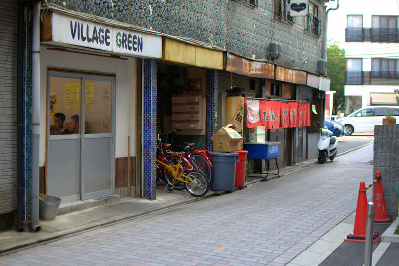 ホルモン焼きにふさわしいレトロで、渋い外観。お世辞にもキレイとは言えない中にあるのは至福のホルモンタイム。暖簾には「たまらんアジェ」と。手前の「Village Green」という看板、別のお店にも見えるのだが、実は待合室。店舗横のここには、新聞や週刊誌、テレビが置かれており、オープンの17時(土日祝は18時)には、そこに人が溢れる。