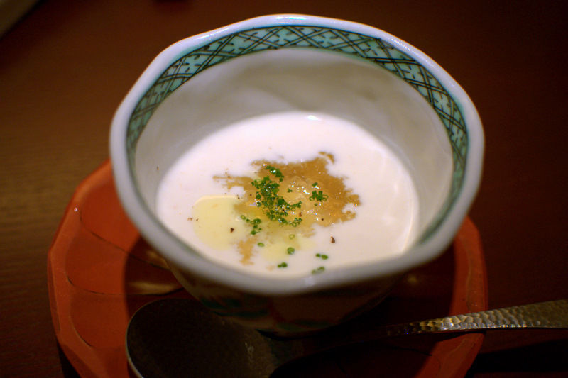 メニューはコースもカルトもあるが、初めてとのことで15,000円のコースを注文。最初はビシソワーズにコンソメを浮かべてある。夏の冷たい前菜からスタート。
