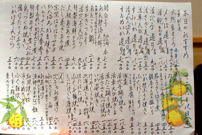 メニューは、活け締めの料理がウリで、刺身と備長炭焼きで食べさせる。冬はあんこうやふぐの鍋もやっているようだ。