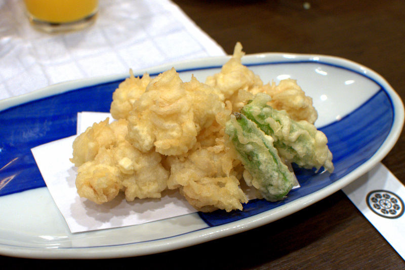 鱈白子の天ぷら(700円)は、ひとつひとつがボリュームがあって、サクッとした中にとろーリ溶け出す白子が口いっぱいに広がる。