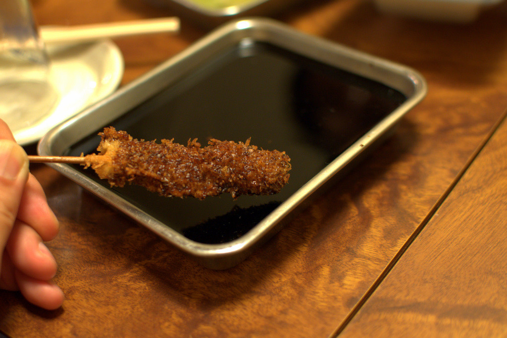 串カツのつけダレはその店の個性を象徴するもののようだ。見た目のどす黒さに比べると、実はそれほど味が強いわけではないのだが。キャベツをつけて食べるのがまたいい。
