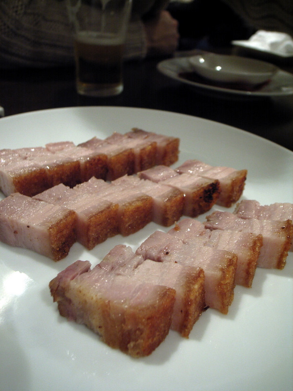 最初は皮付き豚バラのカリカリ焼き。ビールによく合う、皮付きのまま表面をカリカリに焼いた豚バラ。早速美味しい。