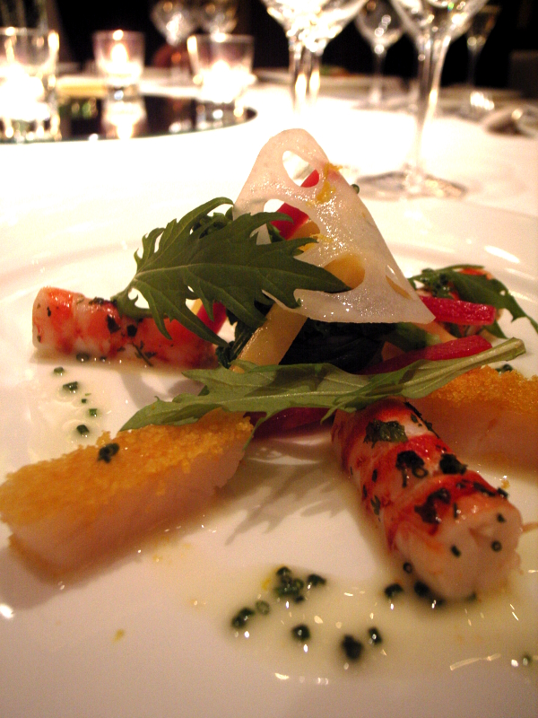 三陸帆立貝と車海老のマリネ 長崎産唐すみ添え 柚子のヴィネグレット。柑橘のさわやかな魚介からスタート。