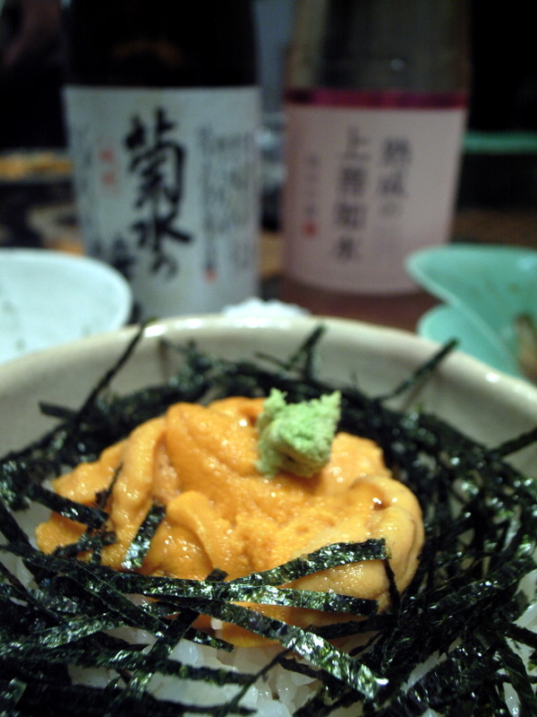 漢の粋さんに「ゲンさん、うまいウニ食いましょう」とお誘いを受け、ご飯と生山葵と泡を持参で駆けつける。ミョウバンを使わない塩水で保存された、積丹の赤ウニ。