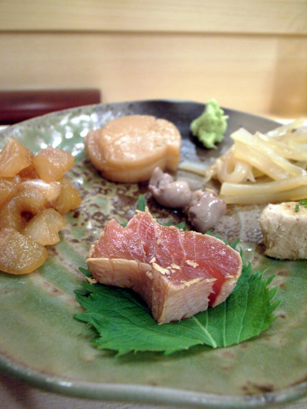 ・前菜(白巻ばい貝の味噌煮・真いかの炭火焼き 柚子胡椒かけ・かずのこ醤油漬け)