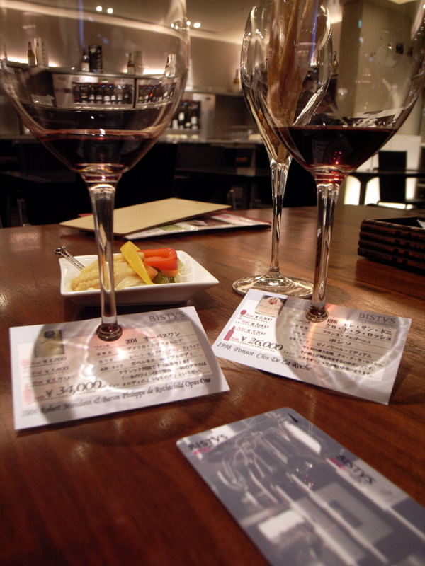 表参道ヒルズのBisty'sも、ワインショップだけど、テーブルに座って試飲ができる。しかも、常時80種類。こりゃいい。試飲用ワインはショップだけあって、1万円を超えない、ワインの購入を前提にしたラインナップだけど、中には、数万円代の、なかなか普段飲めないものも。これが最小20mlだと、1,000円代で飲めるんで、僕ら庶民にもうれしい。