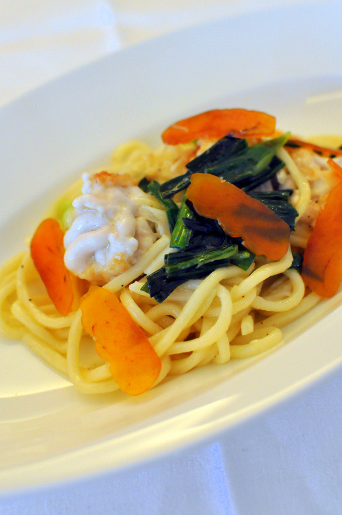 プリフィックス2,100円のランチだが、どうしても、+○○円のメニューへ目が向いてしまう。鱈の白子と葉にんにく、カラスミのパスタ。+500円。生パスタに変えて更に+500円。本能に刺激する白子やカラスミという文字にやられる。